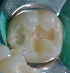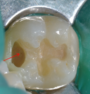 この歯は虫歯を取っていったら、本当にわずかにですが点状に神経が露出してしまいました。(矢印の先)