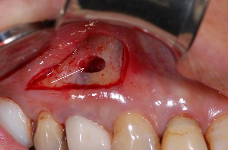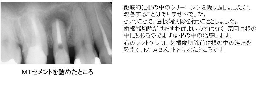 前回と同様に「歯根端切除術」をしないとまず治りません。歯根端切除術をして骨から出ている根の先端を取ってしまえば治ります。