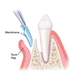 メンブレンと呼ばれる、ポリテトラフルオロエチレンから作られた素材を設置することで、失われた歯周組織の代わりに新しい歯周組織を再生させて、歯の支持構造をできる限り元の状態に戻す方法です。