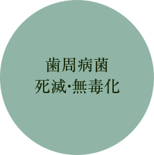 メチレンブルーを主成分とするバイオジェルを歯周ポケットに注入した後、レーザーを照射してバイオジェルに化学反応を起こし、活性酸素を発生させます。人体の安全に配慮した活性酸素によって歯周病の原因となる細菌を殺菌します。